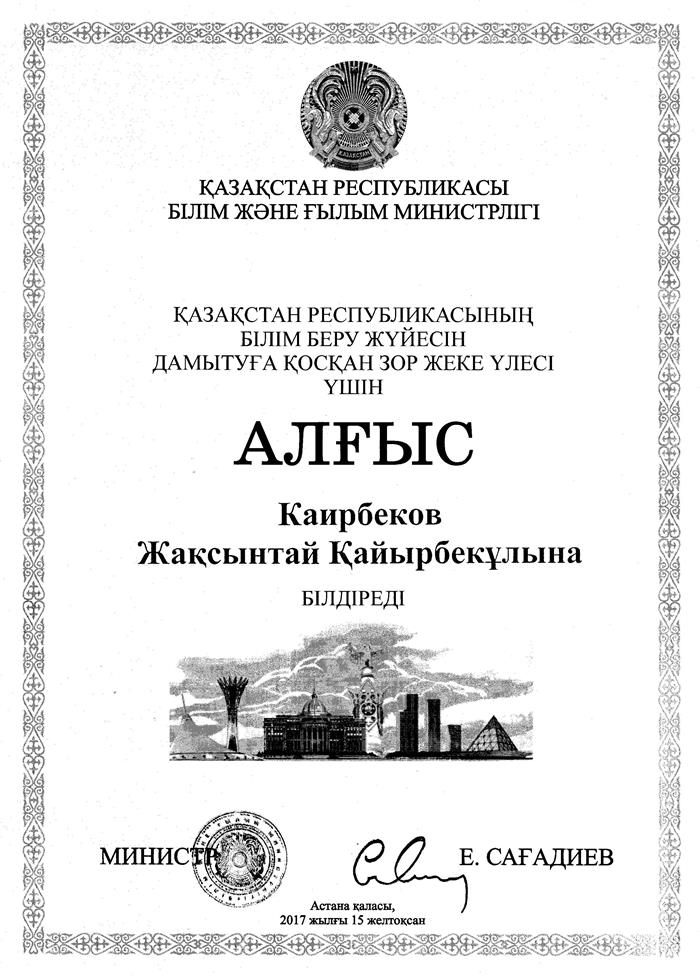 Каирбеков Жаксинтай Кайрбекович был награжден Благодарственной Грамотой министром образования и науки РК за выдающийся личный вклад в развитие системы образования Республики Казахстан! |
