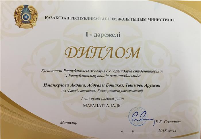 В 2017-2018 уч. году обладателями Дипломов и Грамот, денежных премий за участие и выступление на Международной научной конференции студентов и молодых ученых "Фараби әлемі" стали студенты Аружан Тыныбек, Акдана Иманкулова, Ботакоз Абдуалы, Алғыс Серік (руководитель Н. Данаева), Диана Исмаилова, Виктория Русакова, Чапай Назерке (руководитель Мухамадиева Л.И.), Танкиева Айшолпан (руководитель Муканова Г.К.), Сабина Айдралина, Марина Ауданбай (руководитель Батырханова Ж.А.).