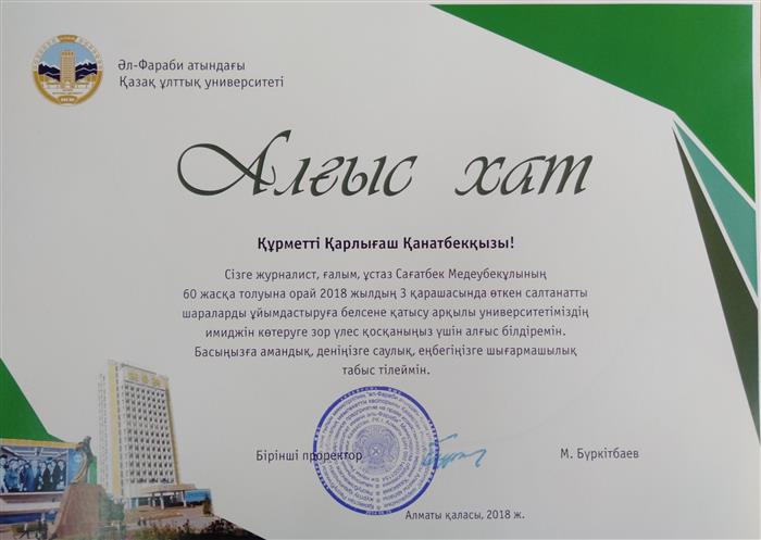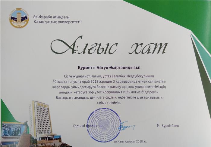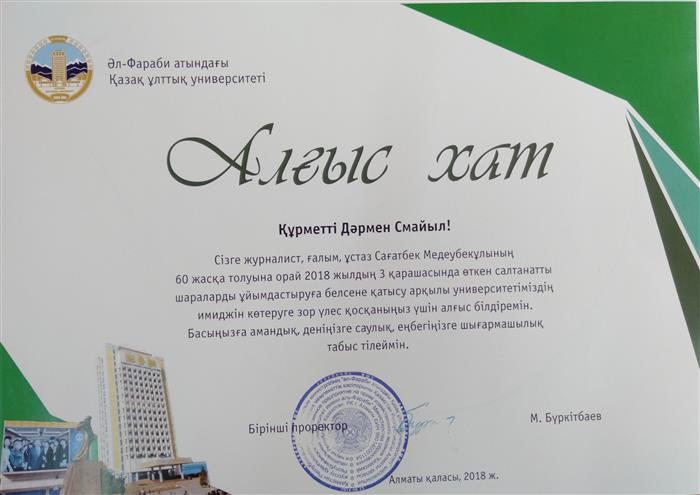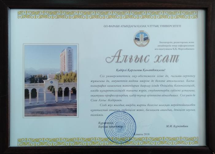 Также преподаватели кафедры (С. Медеубек, К. Мергенбаева, Л. Мухамадиева, Д. Смайл, Н. Данаева) были награждены медалями «КазНУ 80 лет»