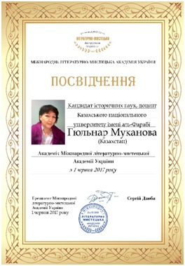 Гюльнар Муканова – академик Международной Академии литературы и искусства Украины. Удостоверение академика и медали Довженко и Гоголя 2 октября 2017 г. на заседании ректората КазНУ им. аль-Фараби Г.К.Мукановой вручил президент Международной Академии литературы и искусства Украины, известный журналист, писатель, переводчик, поэт Сергей Викторович Дзюба.