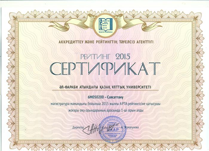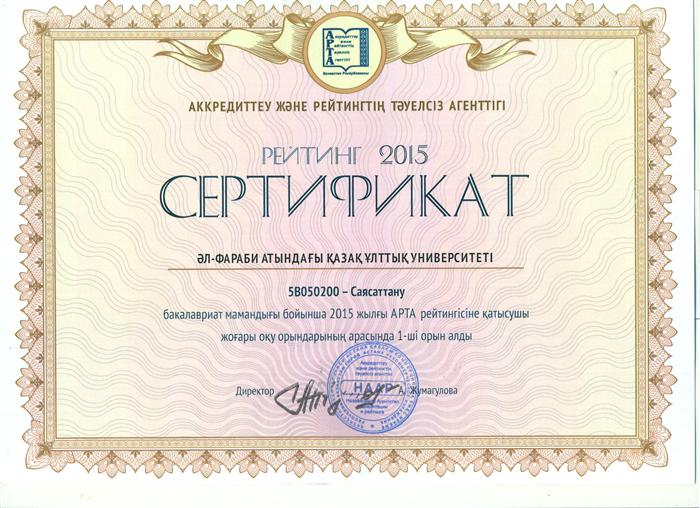 КазНУ им аль-Фараби 5В050200-ПОЛИТОЛОГИЯ специальность по подготовке бакалавриата заняло первое место в независимом рейтинге "Агенство по аккредитации и независимого рейтинга" (НКАОКО) и среди ВУЗов в 2015 году.