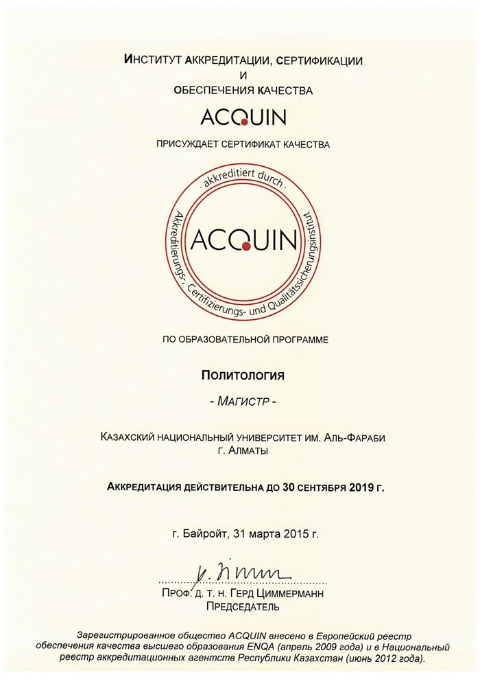 Институт сертификации и качества ACQUIN присудил сертификат качества по программе ПОЛИТОЛОГИЯ МАГИСТР |