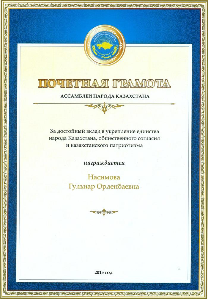 Заведующая кафедрой политологии и политических технологий, доктор политических наук, профессор Насимова Гульнар Орленбаевна была награждена почетной грамотой "За достойный вклад в укрепление единства народа Казахстана, общественного согласия и казахстанского патриотизма" |