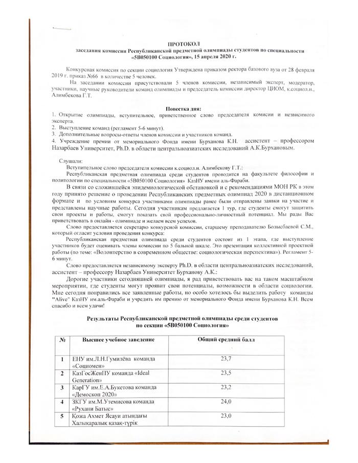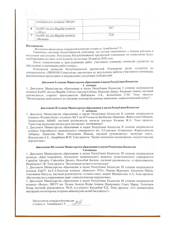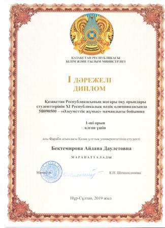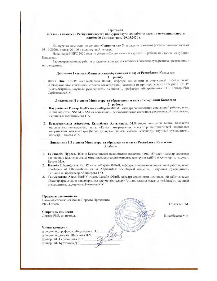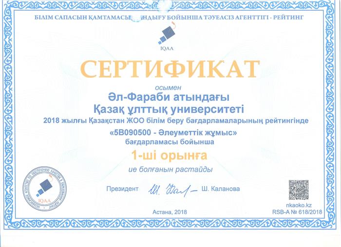 Центр Болонского процесса и академической мобильности МОН РК в рамках национального рейтинга 2014 года присудил І-место КазНУ им.аль-Фараби за подготовку бакалавров по специальности 5В010100 «Социология» и 5В090500 «Социальная работа». |