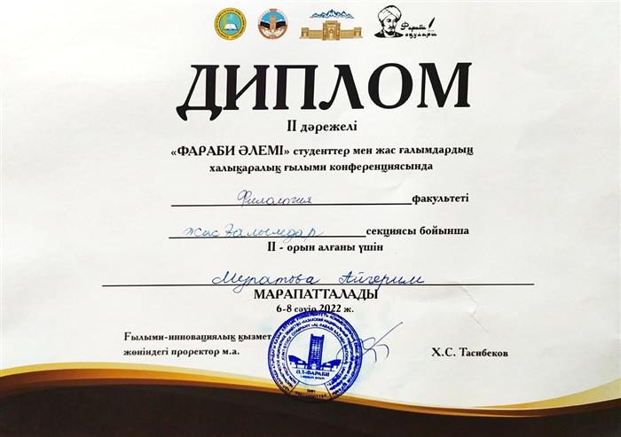6 апреля 2022 года на VII Международной научной конференции студентов и молодых ученых «ФАРАБИ ӘЛЕМІ» Казахского национального университета имени аль-Фараби выступила с научным докладом в секции молодых ученых и заняла третье место, магистрант 1 курса специальности «Переводческое дело (западные языки)» Шәмілхан Аяулым Шәмілханқызы. Тема доклада: «Казахско-турецкие литературные связи» Научный руководитель: Қазыбек Гүлмира Құдайбергенқызы. |